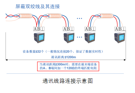 現(xiàn)場多功能儀表以手拉手方式通過屏蔽雙絞線(RVSP2*1.0)進行通訊連接,每根總線低壓電力儀表25只左右。具體連接示意圖如下所示: