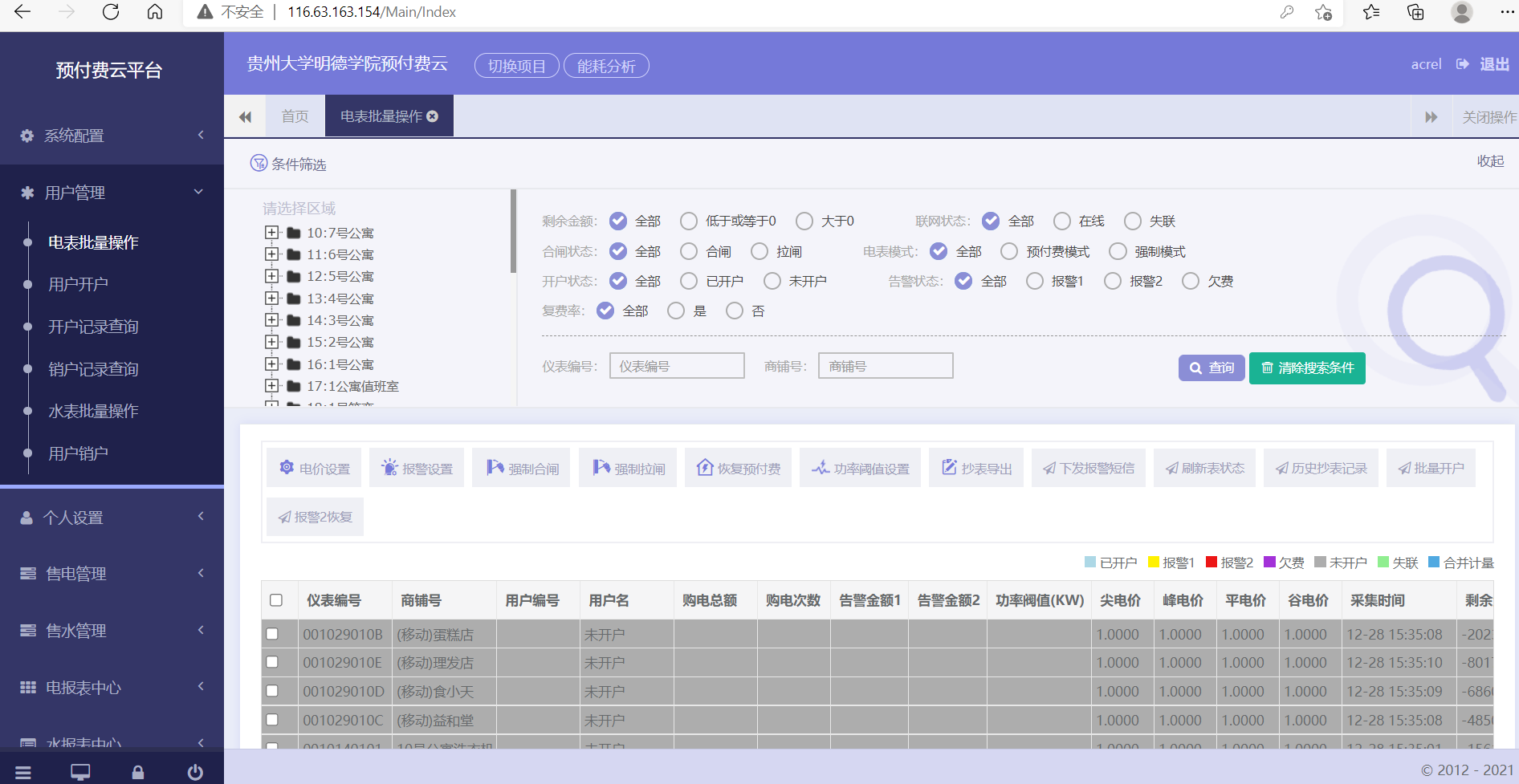 系統針對商鋪開戶不僅支持一戶一表,也支持一戶掛多表的需要;同時支持和解決了項目改造后新老表切換時,老表金額轉入的問題;支持峰谷電價,支持一表一電價;可對單表設置功率過載的閾值,也支持設置單表金額報警的兩級閾值。