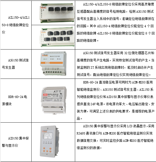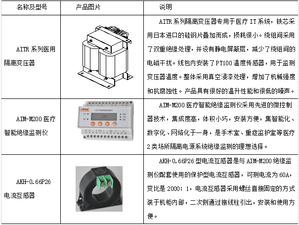 醫用IT系統絕緣監測及故障定位產品(七件套)包括AITR系列醫用隔離變壓器、AIM-M200醫療智能絕緣監測儀、AKH-0.66P26電流互感器、AIL150-4/AIL150-8絕緣故障定位儀、ASG150測試信號發生器、HDR-60-24電源模塊和AID150集中報警與顯示儀等,產品如表1所示。