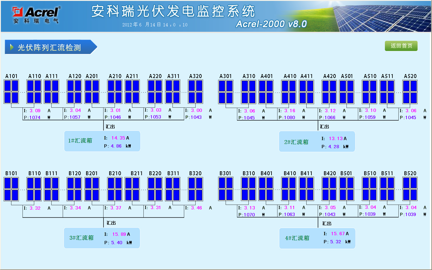 太陽能光伏電站主要由光伏電池陣列、匯流箱、低壓直流柜、逆變柜、交流低壓柜、升壓變壓器等組成,最后產(chǎn)生的交流直接并入電網(wǎng)。針對每個環(huán)節(jié)電力參數(shù)檢測的需要,安科瑞推出了AGF系列光伏匯流采集裝置、ACR10R系列防逆流監(jiān)控裝置、APQM系列電能質(zhì)量在線監(jiān)測裝置、匯流箱及并網(wǎng)柜等產(chǎn)品,分別應用于匯流箱、直流防雷柜及交流柜中,并通過Acrel-2000 V8.0光伏發(fā)電監(jiān)測系統(tǒng)實現(xiàn)后臺集中監(jiān)控。