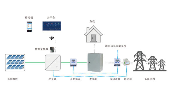 光伏陣列接入組串式光伏逆變器,或者通過匯流箱接入逆變器,然后接入企業380V電網,實現自發自用,余電上網。在380V并網點前需要安裝計量電表用于計量光伏發電量,同時在企業電網和公共電網連接處也需要安裝雙向計量電表,用于計量企業上網電量,數據均應上傳供電部門用電信息采集系統,用于光伏發電補貼和上網電量結算。