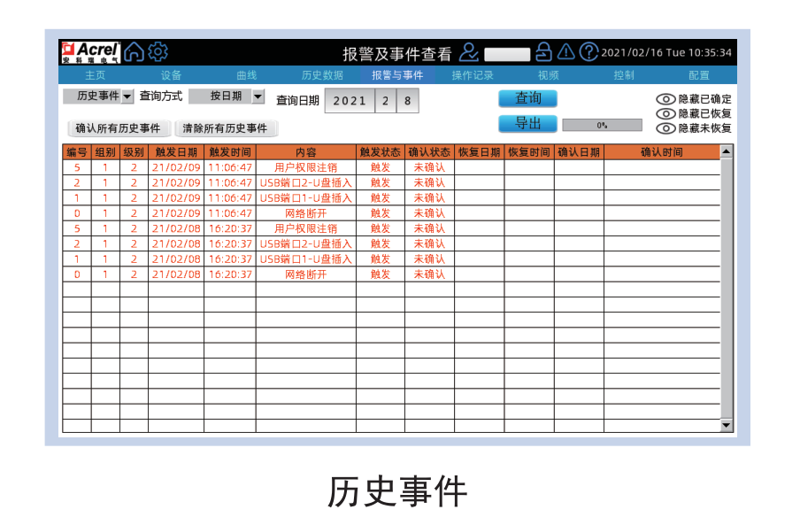 在“歷史事件”的界面,同“歷史數據”界面一樣,表格上方的查詢及導出按鈕分別提供相應的查詢和導出功能,并且可以根據所選擇的不同查詢方式進行不同方式的查詢功能。