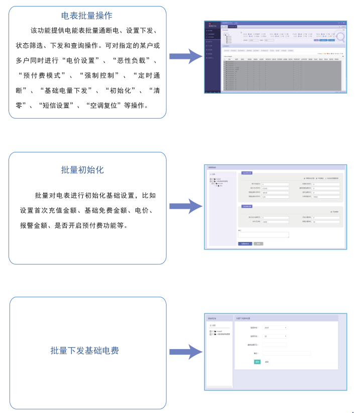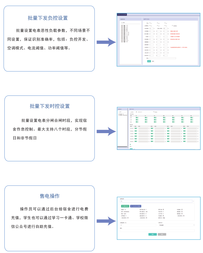 支持時間管理控制。L1、L2、L3可分別設置為工作日和節假日模式,每天最多可設置8個時間段,每個時間段可分別設置為合閘狀態或夜間模式,合閘時間段內電表保持合閘,夜間時間段內,支路功率若大于夜間允許功率 上限便跳閘。